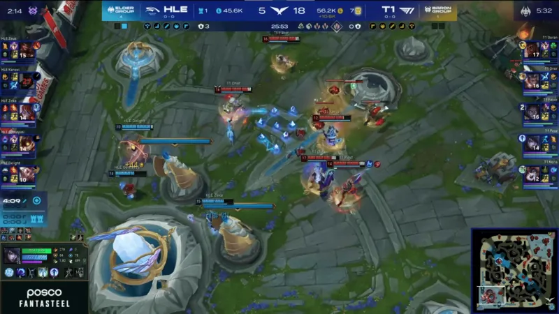 比赛第22分钟,T1抓掉Zeus纳尔后拿下大龙,随后中路打出0换4大胜HLE→